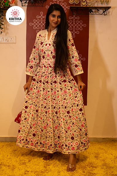 The kurta is a long, flowy A-line/Anarkali–style silhouette with a graceful flare. It features an off-white base adorned with dense floral embroidery in shades of pink, red, maroon, and green, creating a rich, traditional Kashmiri-style look. The neckline is a simple V-cut, adding elegance without overwhelming the design. The sleeves are three-quarter length, decorated with the same floral pattern, giving the outfit a balanced and cohesive appearance. Th overall look is soft, feminine, and festive—perfect for ethnic occasions.