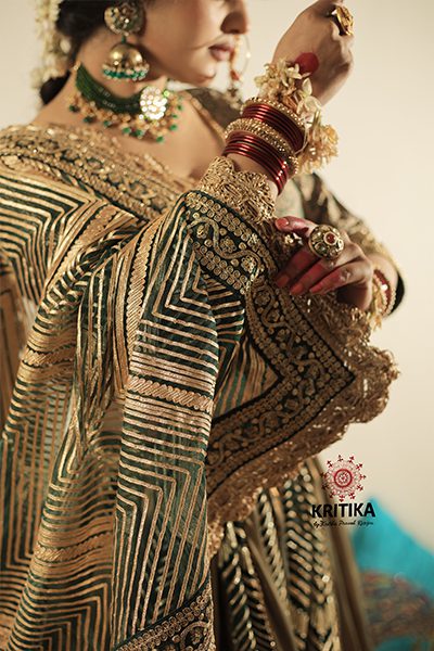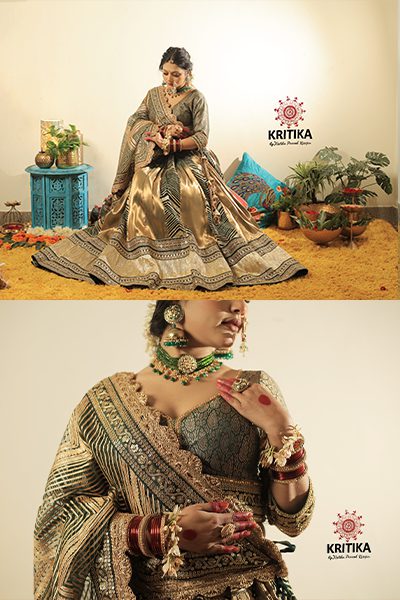 Our Hariyali Lehenga is the epitome of femininity and grace. The vibrant yet soothing hue combined with Zari silk Paneling and Gota work fabric makes it an ideal pick for Mehendi ceremonies. Designed with intricate craftsmanship, this lehenga strikes the perfect balance between traditional aesthetics and contemporary style, making it a wardrobe essential.