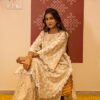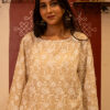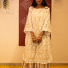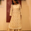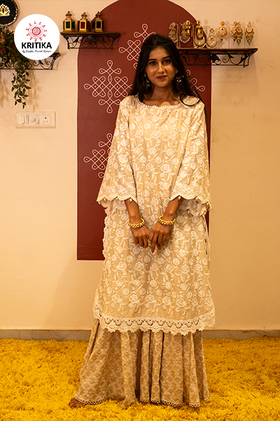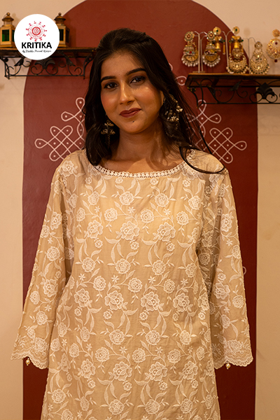 This elegant set features a stunning beige kurta adorned with intricate, all-over white floral lace embroidery that adds a soft, sophisticated charm to the outfit. The scalloped lace borders on the sleeves and hem enhance its delicate, feminine appeal, giving the kurta a beautifully refined finish.