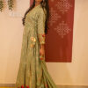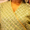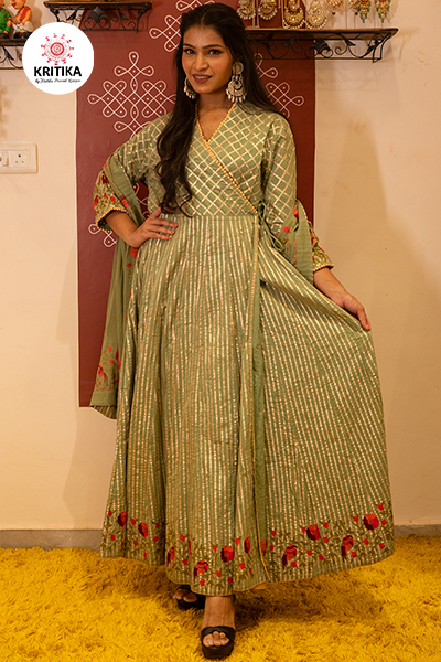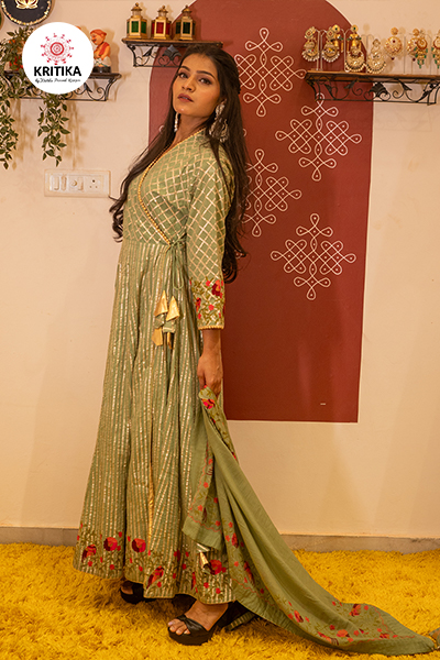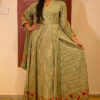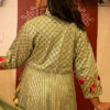Anarkali – The kurta is a beautiful pastel green shade, giving it a refreshing and graceful look. It features a golden geometric pattern across the entire bodice, adding a festive shimmer. The sleeves and lower portion of the kurta are embellished with striking red floral embroidery that stands out vibrantly against the soft green base. The silhouette is flowy and full-length, creating a regal, Anarkali-style flare. The neckline has a delicate golden border that complements the embroidery and overall design.