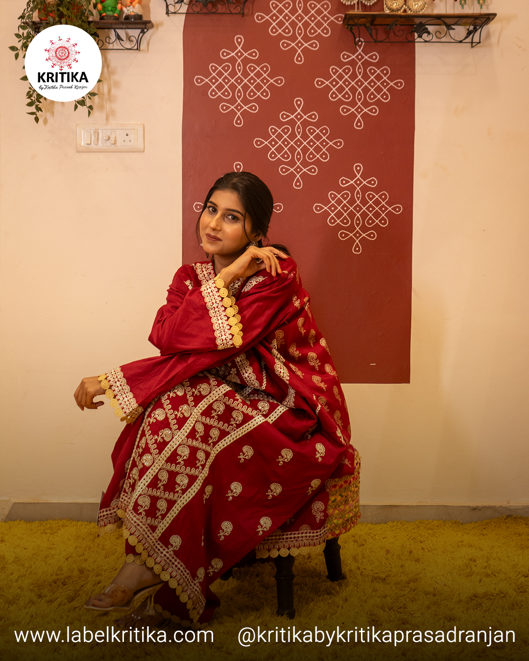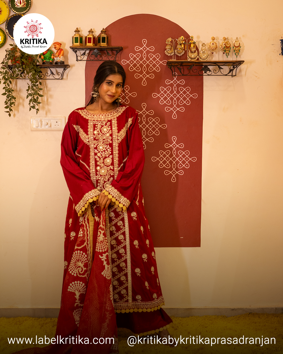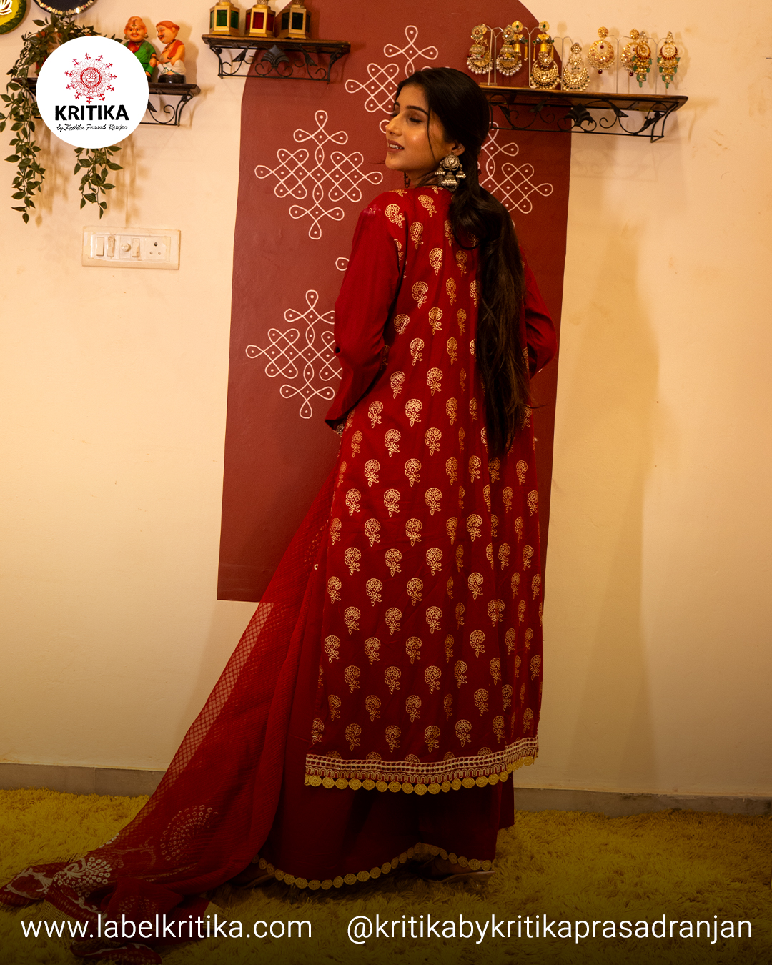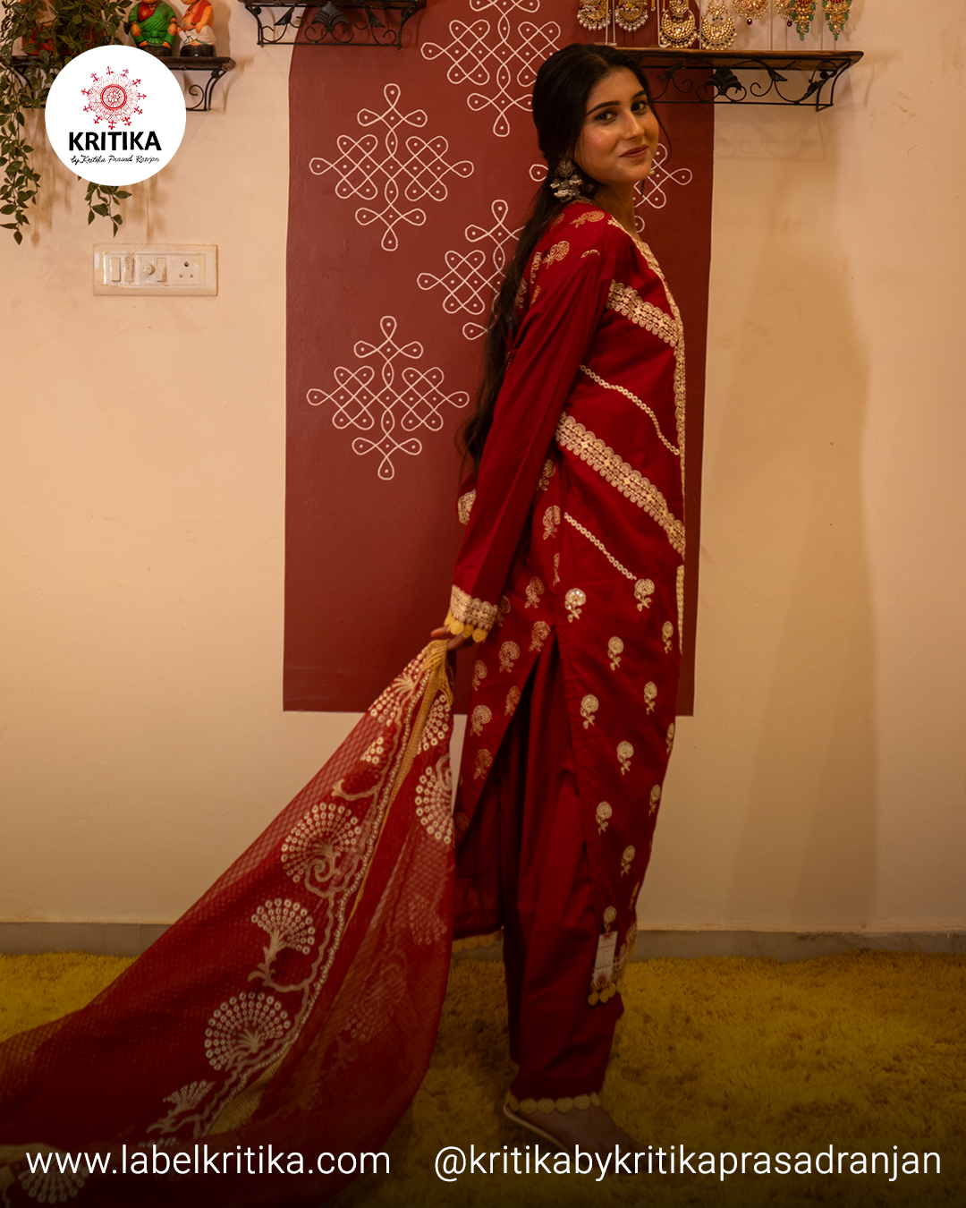 Bottom – Matching maroon bottoms with a subtle embroidered hem and delicate lace detailing that complement the kurta perfectly, adding balance and elegance to the set.