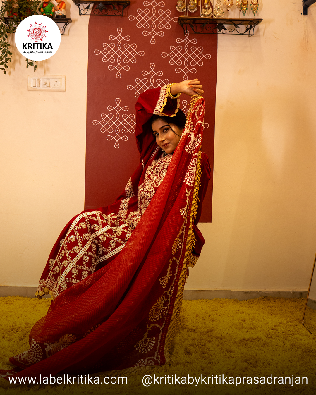 Kurta – A rich maroon kurta adorned with heavy cream thread embroidery featuring traditional motifs on the front, sleeves, and borders. The neckline is detailed with intricate patterns, while the sleeves are finished with charming tassel edging for a graceful touch.